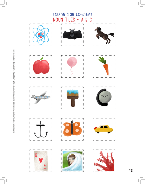 A soft covered spiral Literacy Guide featuring games that teach children about nouns and verbs. The five games include directions and 130 noun tiles to use with the games. Teach the lessons in order 1-5 so that kids understand the concepts as they are introduced. The games are child tested and parent approved. Patricia invites you to play the No-Ve-Mo game and get your kids moving and interacting with the noun tiles as children move their character noun tiles the way the verb suggests. Have fun engaging in educational games and teach your children the importance of nouns and verbs in the English Language